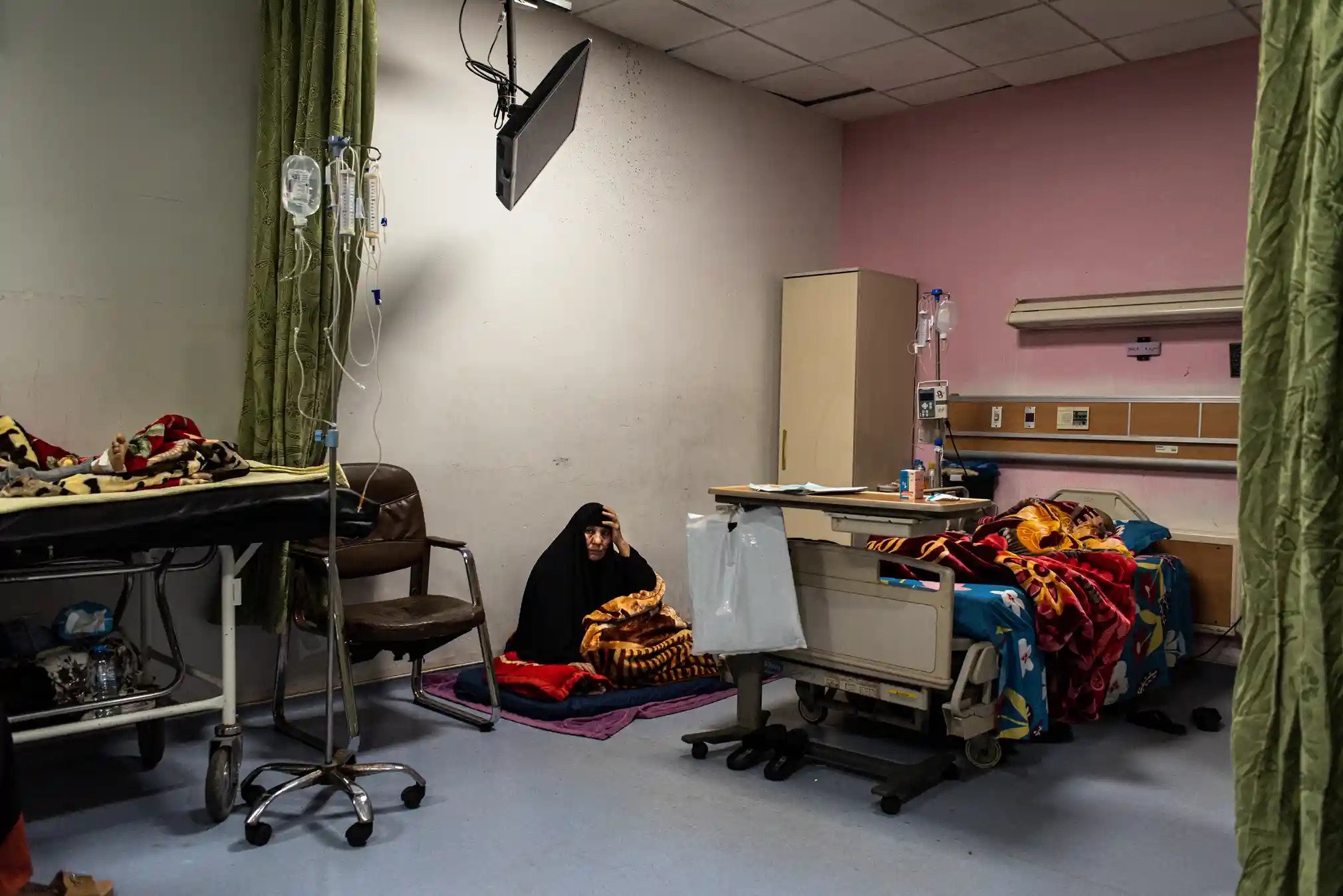 تنتظر شيعة عباس – 60 عامًا، من الناصرية – بجوار سرير ابن أختها علي سعد هاشم – 11 عامًا – الذي يُعالج من سرطان الدم بمستشفى البصرة للأطفال، يضم جناح أورام الأطفال 45 سريرًا ويقضي الأطفال المرضى شهورًا هنا.
