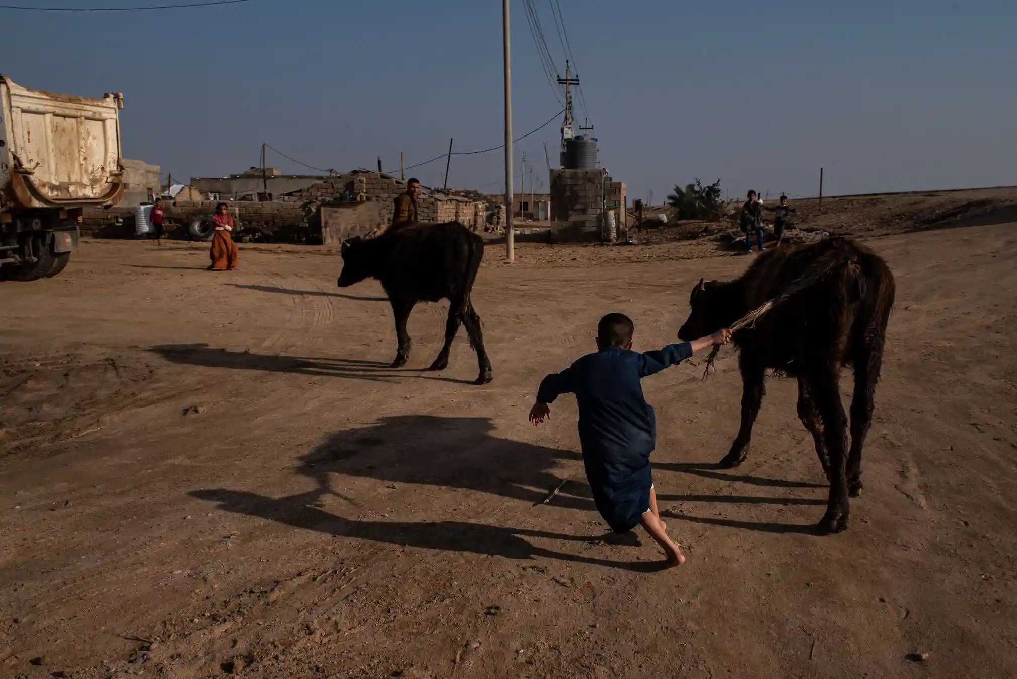 يلعب الأطفال مع جاموس الماء في شمال البصرة، في السنوات الأخيرة جفت الأهوار تمامًا، ما حرم المجتمع من الأسماك ومراعي ماشيتهم.