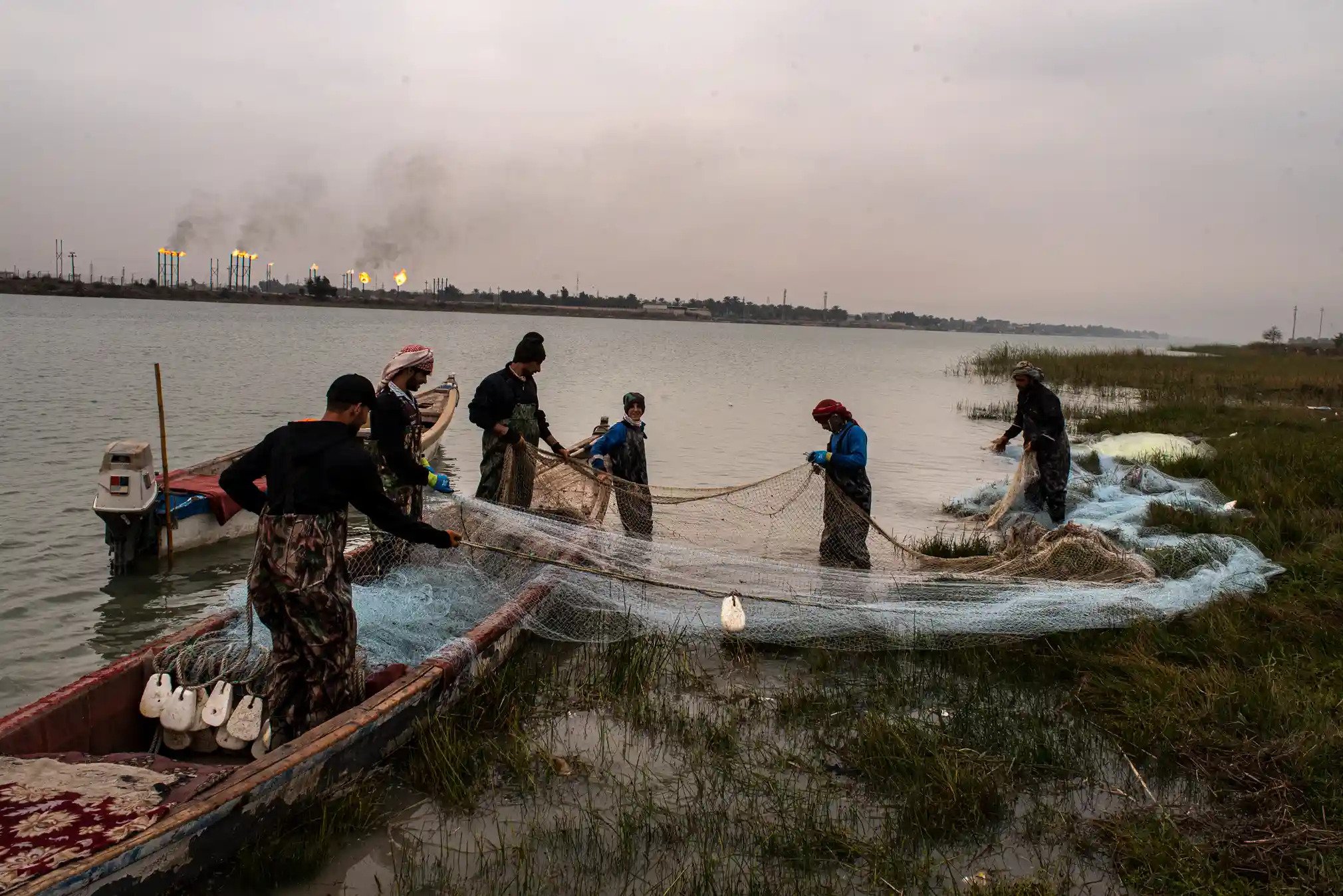 اعتاد مهدي مطير – 57 عامًا وأب لـ5 أطفال – أن يصطاد السمك في أهوار البصرة الشمالية، ويستطيع مطير من قريته أن يرى الدخان المتصاعد من حقل نفط الزبير، يقول مطير إنه بعد عام 2021 جفت الأهوار نتيجة بناء شركة نفط لمحطة مياه جديدة.