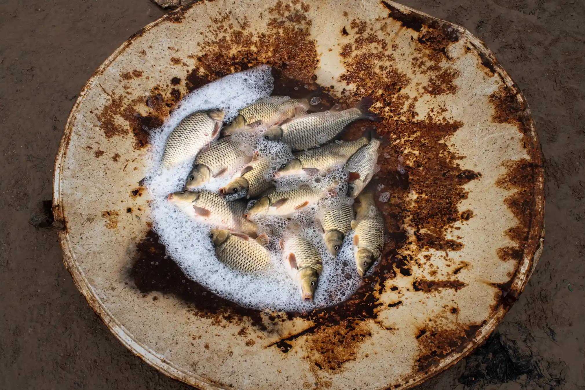 تُباع الأسماك بجوار نهر شط العرب، لكن حسبما يقول الصياديون فإن الأسماك لم تأت جميعها من هذا النهر بل يشترونها من مكان آخر، فمنذ 2017 لم تعد هناك أسماك كافية في نهر شط العرب الملوث للغاية.