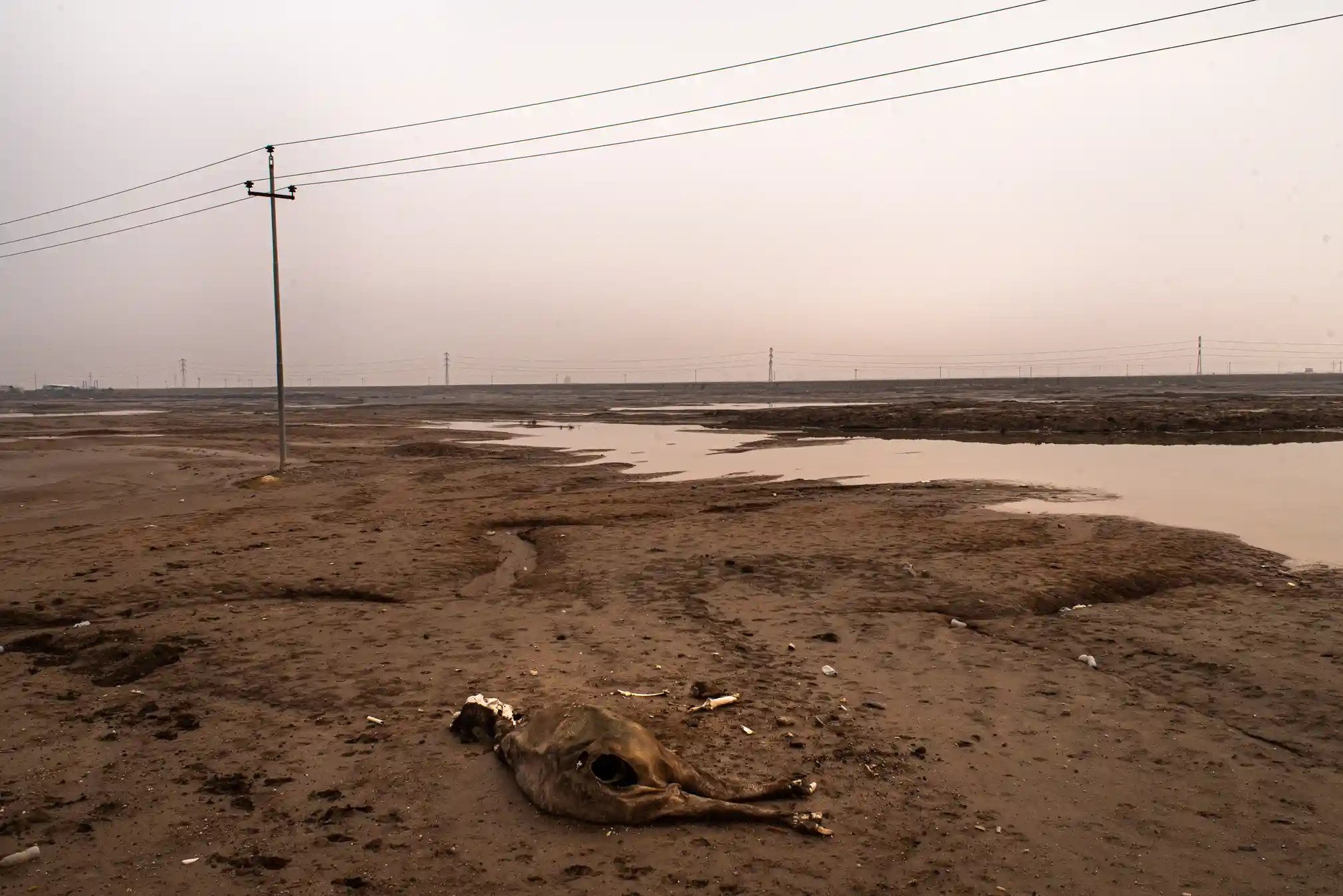 جثة جاموس الماء على الأرض في أهوار البصرة الشمالية التي كانت مصدر معيشة المجتمع المحلي المكون من المزارعين والصيادين، أصبحت المياه شحيحة في العشر سنوات الأخيرة ويقول السكان المحليون إن الأهوار جفت تمامًا هذا العام بعد أن بنت شركة إيطالية محطة مياه لإمداد حقول النفط بالمياه.