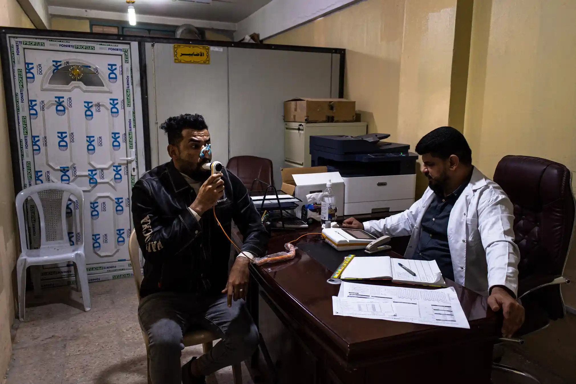 يختبر الطبيب سعدي هادي سعة رئتي عامل تكرير النفط في المركز المحلي للصحة والأمان المهني، يقول هادي إن عمال النفط والغاز يعانون عادةً من مشكلات تنفسية لأنهم لا يرتدون أقنعة أو أي معدات حماية أخرى خلال العمل، في عام 2022 أجرى المركز اختبارات لنحو 18077 عاملًا، لكن النتائج لم تُنشر علانية.