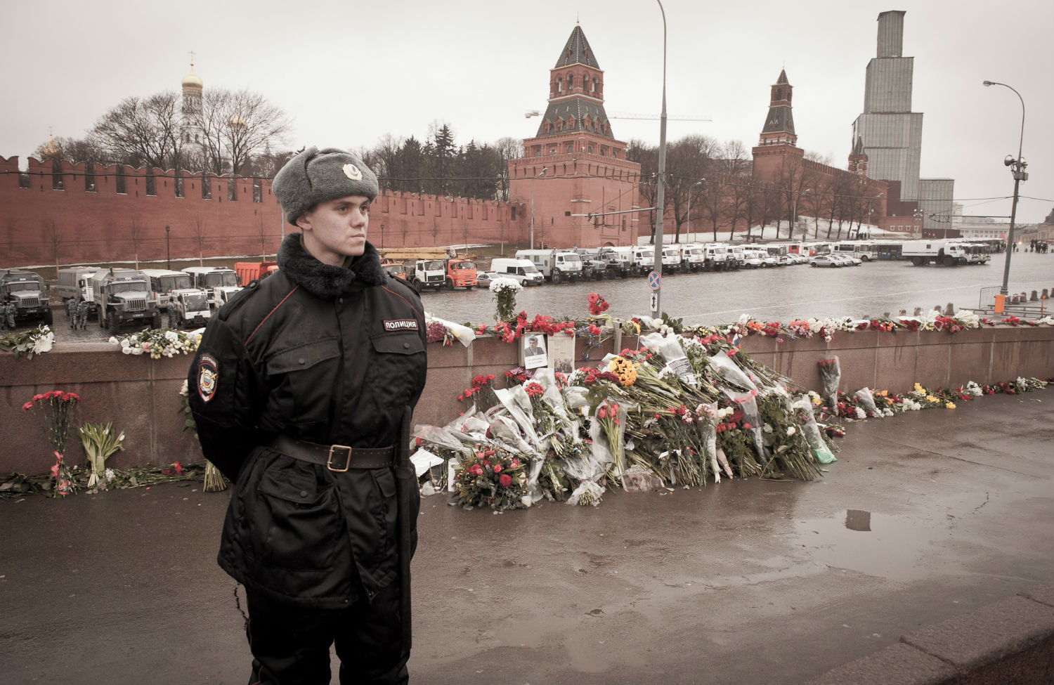 ضابط أمن روسي وخلفه الورود التي وضعها أنصار نِمتسوف في المكان الذي قُتل فيه أمام أسوار سباسكي الشهيرة بالكرملين