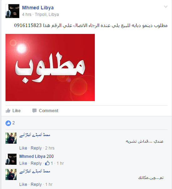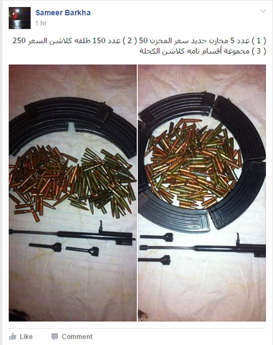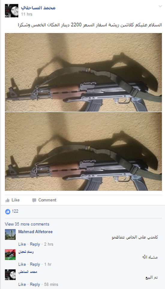 الصفحة أخذت في عرض أنواعًا كثيرة من الأسلحة للبيع، بينها قواعد لصواريخ ثقيلة مثل صاروخ “تاو” الأمريكى المضاد للمدرعات، إضافةً إلى الأسلحة الفردية والمناظير الليلية وغيرها، لكن تلك كانت واحدة من ضمن العديد من الصفحات والمجموعات المنتشرة فى هذا الشأن والتى ليس من الصعب الوصول إليها.