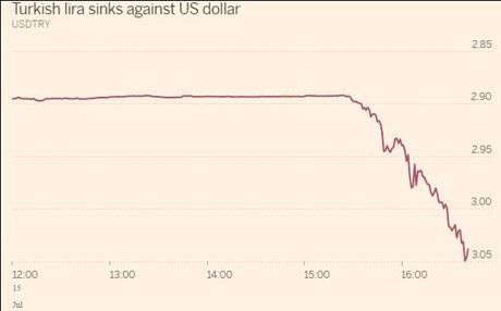 لحظة تأكد أن هناك انقلاب عسكري حاصل على الحكومة التركية، انخفضت الليرة التركية إلى أدنى مستوى في ثلاثة أسابيع أمام الدولار في أواخر التعاملات في سوق نيويورك يوم الجمعة حيث هبطت الليرة أكثر من 5% أمام الدولار ليتم تداول الدولار عند 3.0415 ليرة، وتراكض الناس إلى ماكينات سحب المال المصرفية المنتشرة في الشوارع كما أكد الناس المتواجدين في ميدان تقسيم في تلك اللحظة.