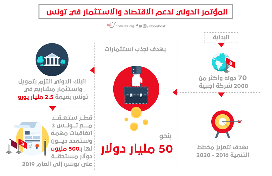 ويعد هذا المؤتمر خطوة لتعريف المستثمرين العرب والأجانب بالإصلاحات التي أجرتها الحكومة خلال الفترة الماضية من جهة واختبارًا لقياس مدى جدية الدول المانحة والمستثمرين برغبتهم بالاستثمار في تونس من جهة أخرى.