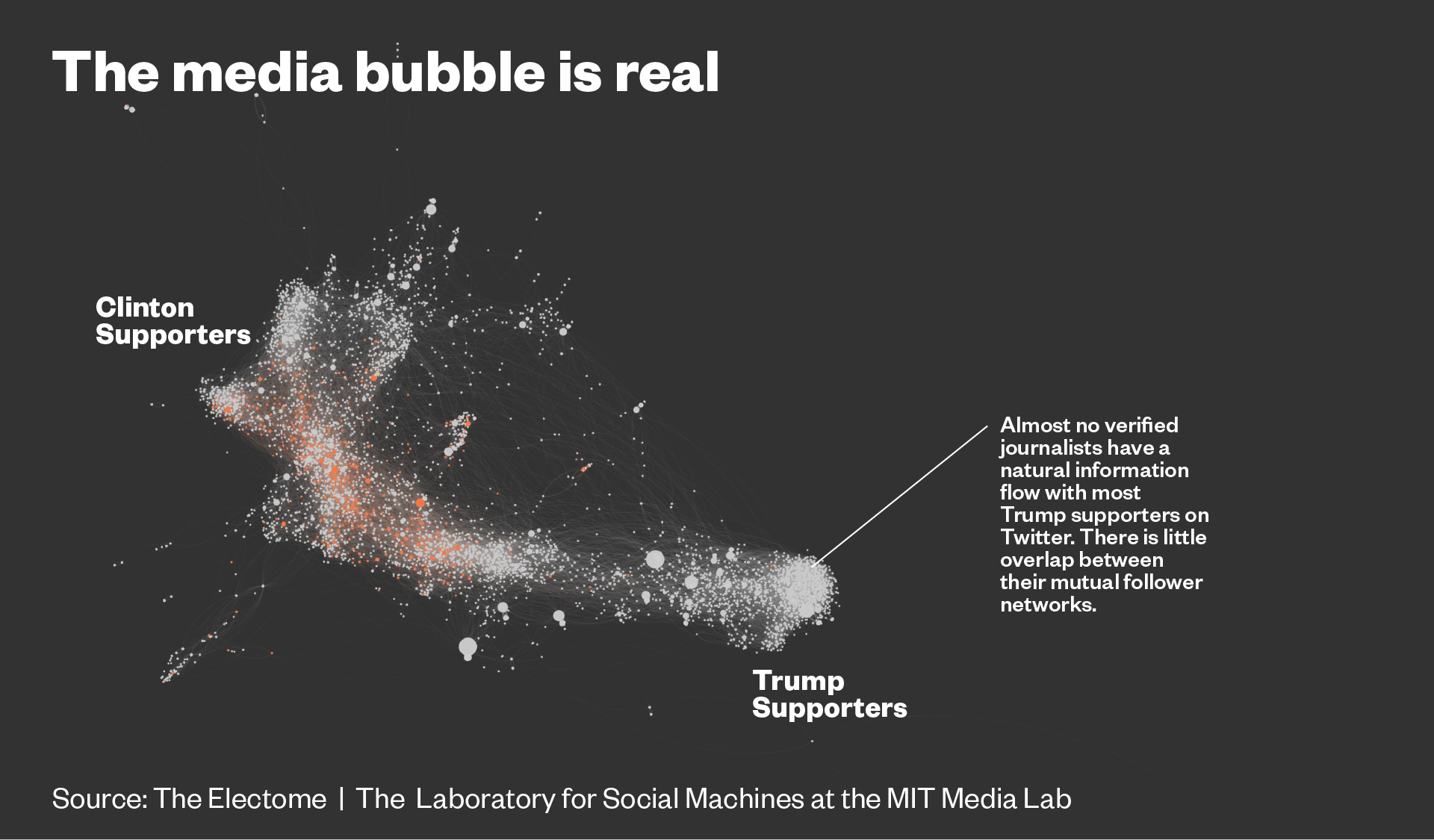 فأصبح الأمر مقسمًا بناء على الايدولوجيا والمنفعة، مع فرص أقل لتدفق المعلومات من معسكر إلى الآخر، أي فرص أقل لانتقال المعلومات بين شرانق الانترنت الداعمة لترامب، وبين المؤسسات الاعلامية التي من المفترض أن تكون منيعة ضد التحيز السياسي.