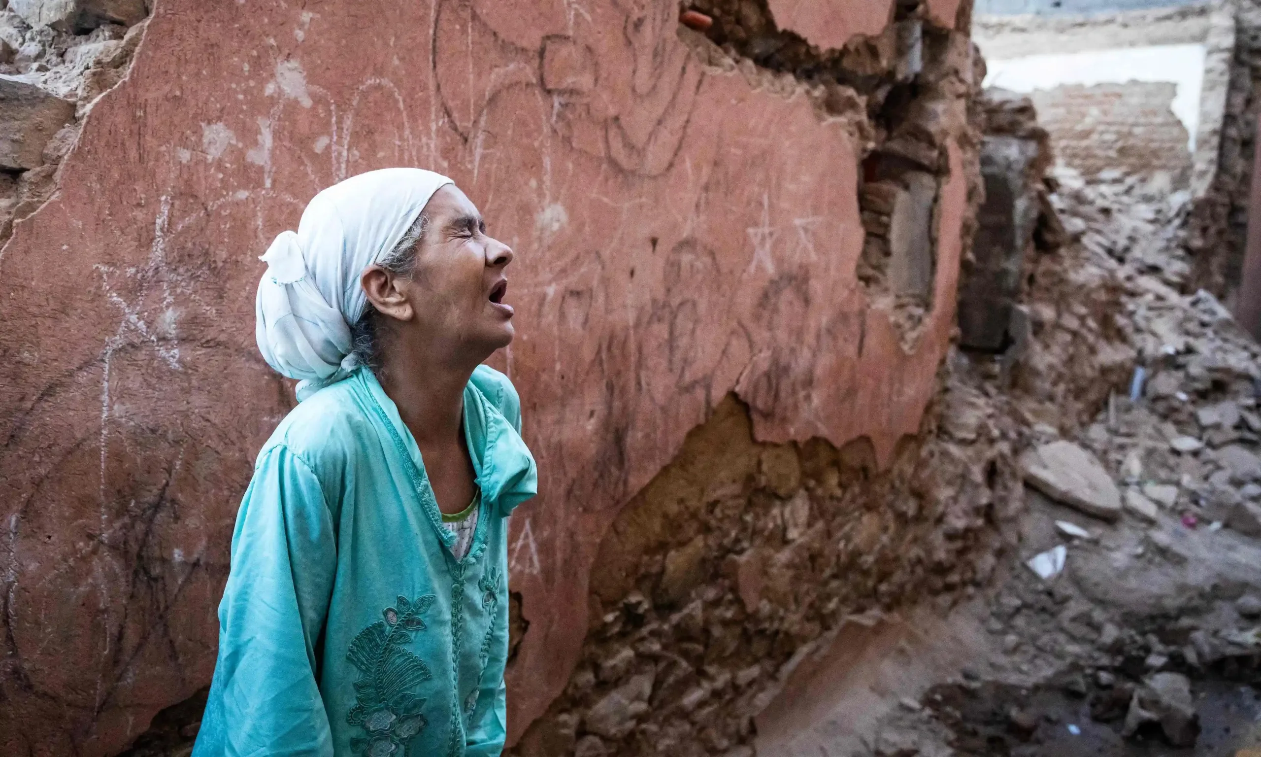 سيدة تقف في حزن أمام منزلها الذي دمره الزلزال.