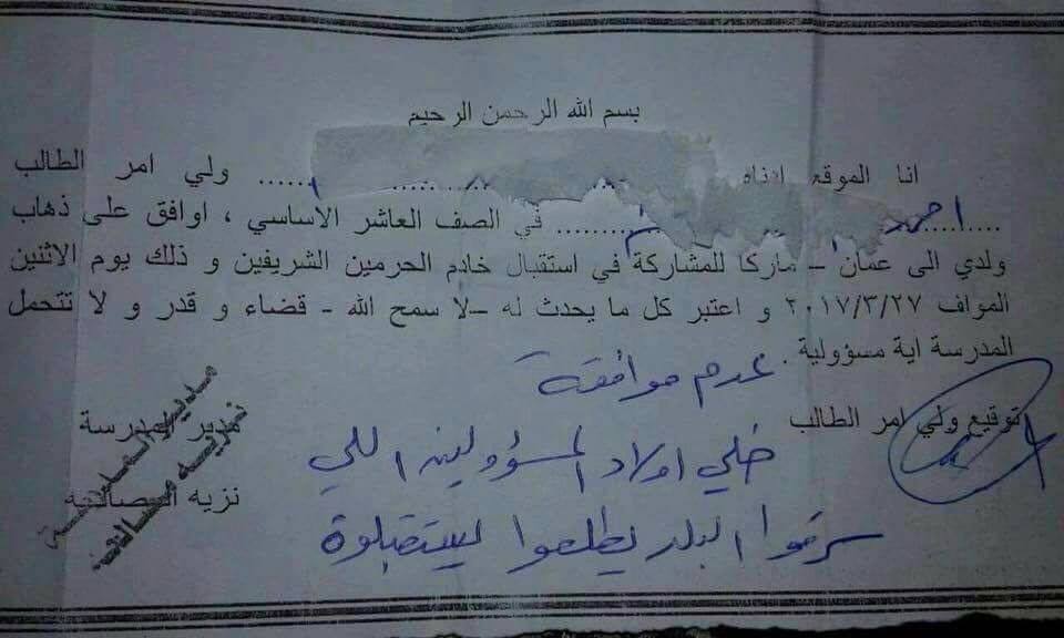 حيث لاقت هذه الدعوة استغراب بعض الأهالي واستنكارهم، بحيث رأى البعض أن “تقديم الطلاب الأطفال للخروج في مثل هكذا احتفال عن غير فهم منهم وقبول إرادي، هو أمر مستجهن، وفيه بعض التملّق لإجل ابهاج الضيوف السعوديين”، إضافة لذلك، رفض بعض أهالي الطلاب ما تضمنته أوراق موافقة الطلاب في هذا الاستقبال من قبل ذويهم، بحيث لو وقع لهم مكروه فهو سيكون “قضاءً وقدرًا”. فيما ذهب البعض بدعوة “أبناء المسؤولين الذين قاموا بسرقة البلد إلى الخروج لاستقبال الوفد الملكي السعودي”.
