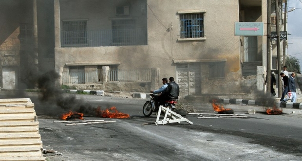 الإطارات المشتعلة في أثناء الاشتباكات المعادية للحكومة في درعا