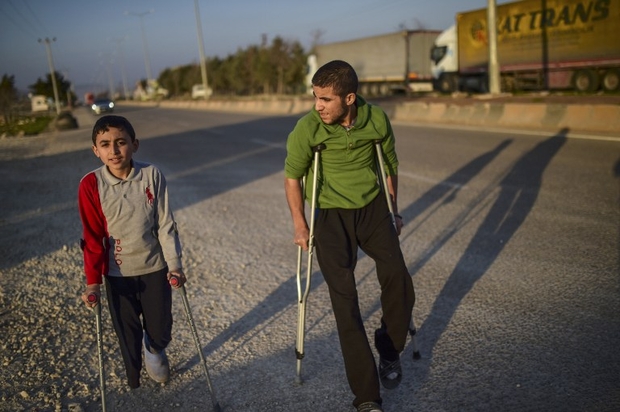 صديقان مصابان، محمد من حلب وأحمد من إدلب، يسيران في مخيم كيليس للاجئين جنوب وسط تركيا