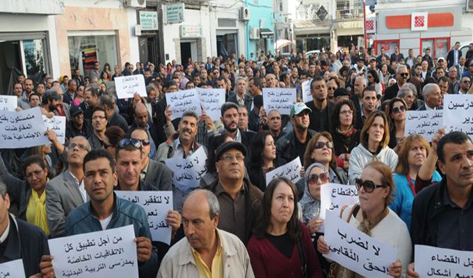 عبر النقابيون خلال احتجاجاتهم عن رفضهم لديوان الخدمات المدرسية وللنقل غير القانوني التي قام بها وزير التربية خلال العطلة المدرسية الأخيرة