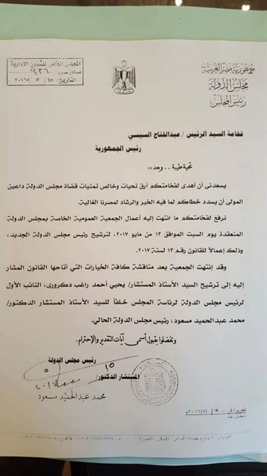 خطاب مجلس الدولة للسيسي بتسمية المرشحين لرئاسة المجلس