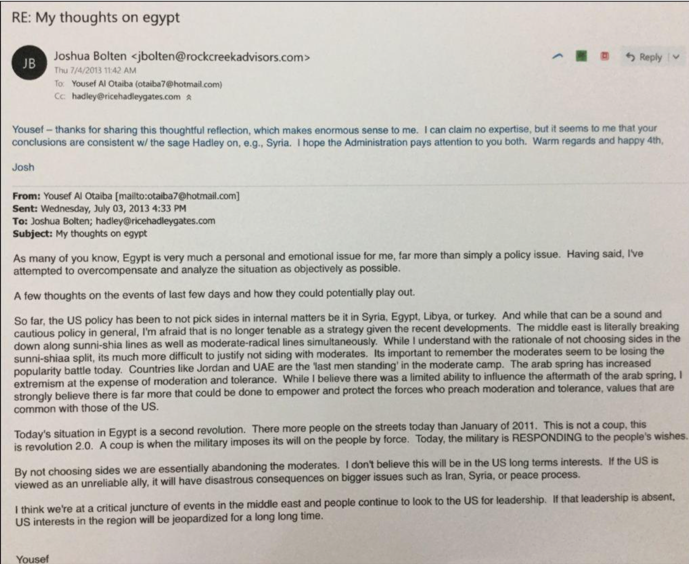 ومن خلال هذه الرسائل المسربة، أخذ يتضح شكل الحوارات التي كانت تدور بين الجانبين، ففي رسالة بتاريخ 3 من تموز/يوليو سنة 2013، أي بعيد الانقلاب العسكري الذي شهدته مصر والذي أطاح بالرئيس محمد مرسي، حاول العتيبة تسليط المزيد من الضغوط على مسؤولين سابقين في إدارة الرئيس بوش، على غرار جوشوا بولتون، وستيفن هادلي الذي يشغل الآن منصب مستشار في مؤسسة “رايس هادلي غايتس”، وذلك بغية فرض رؤيته بشأن مصر والربيع العربي بشكل عام، وفي هذه الرسالة، أفاد العتيبة أن “دولاً مثل الأردن والإمارات تمثل آخر ما تبقى في صلب معسكر الاعتدال، لقد أدى الربيع العربي لتغذية التطرف على حساب الاعتدال والتسامح”.
