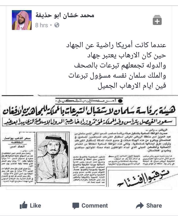 كان الشيوخ والأمراء السعوديون يصرفون بسخاء، ويقدمون المبالغ النقدية الضخمة لمختلف الجماعات الجهادية في أفغانستان، ومن بين هؤلاء الأمير الشاب آنذاك، الملك حاليًا، سلمان بن عبد العزيز