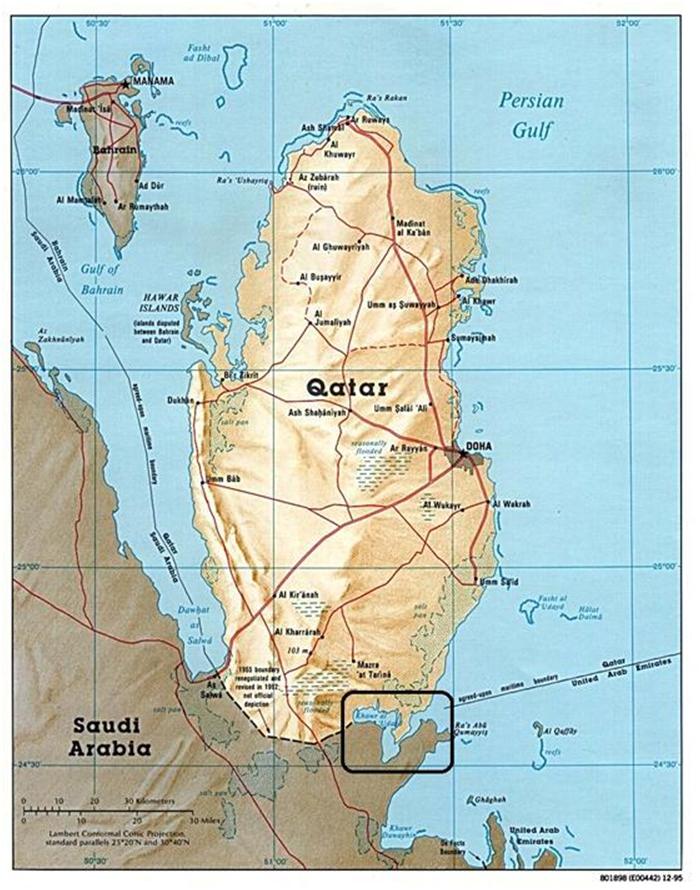 هنا، وبالنظر إلى الخريطة، وقعت منطقة تدعى “خور العديد” مدارًا للخلاف بين البلدين في المنطقة الساحلية الفاصلة بين الإمارات وقطر، وكانت هذه النقطة بالتحديد السبب في اعتراض السعودية على إنشاء جسر بحري بين الإمارات وقطر عام 2005.