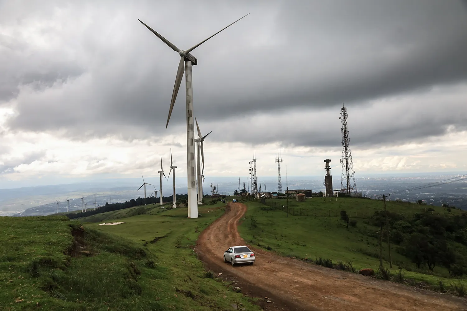 على اليمين: مجموعة من العمال يغادرون منصة النفط البحري بتروبراس موقع بناء المنصة في أنغرا دوس ريس، البرازيل، في 21 آب/ أغسطس 2008. وعلى اليسار: طريق ريفي يمر عبر توربينات الرياح في محطة كهرباء في تلال نجونا بمقاطعة كاجيادو، كينيا، في التاسع من شهر أيار/ مايو 2021.