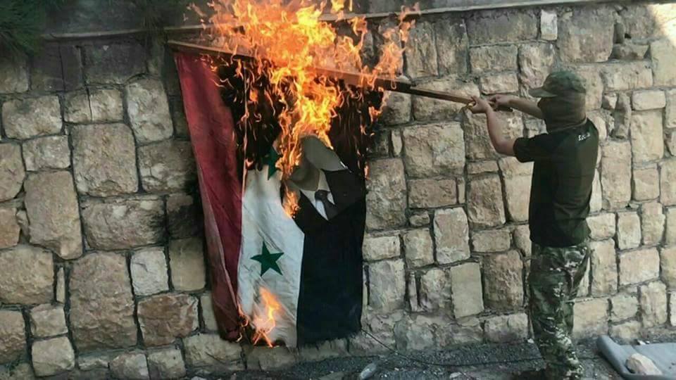 إحراق مقاتلي الهيئة لعلم النظام السوري في معركة ريف حماة الشمالي