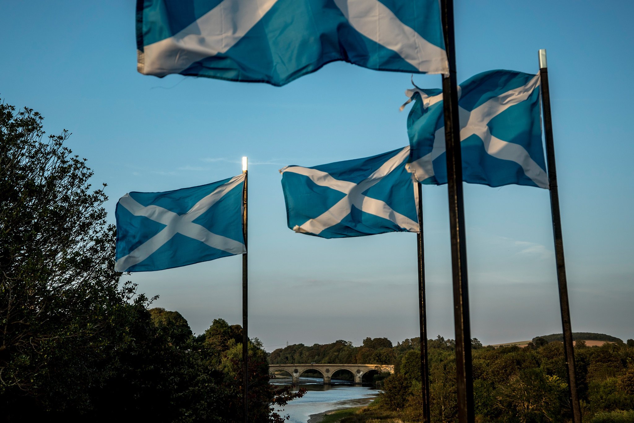 الأعلام الاسكتلندية تحلق على الحدود بين إنجلترا واسكتلندا. خلافا للاستفتاء الكاتالوني، تمت عملية التصويت في اسكتلندا سنة 2014، بمباركة من قبل الحكومة المركزية في لندن