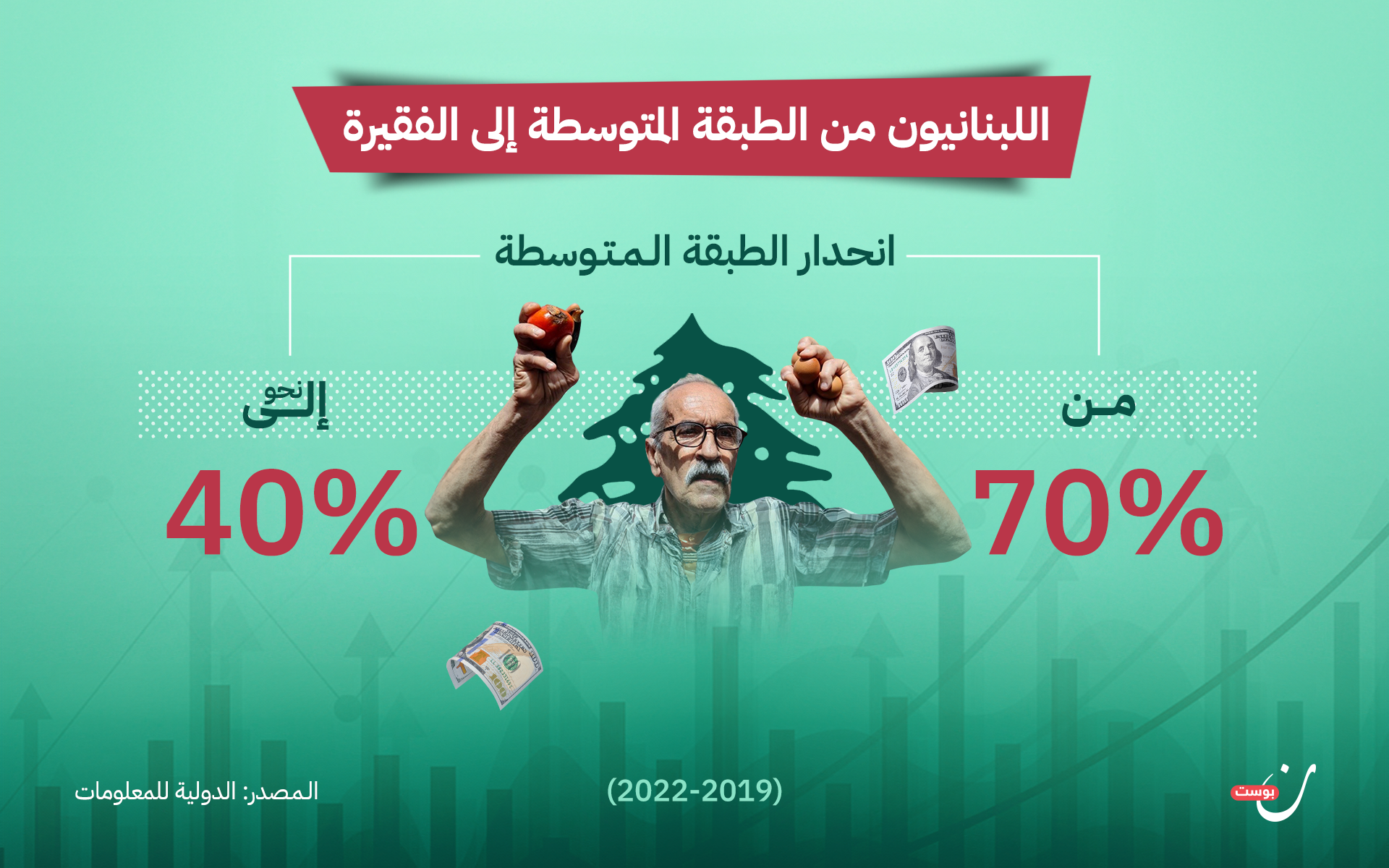 أدى التدهور الاقتصادي الحاد الذي ضرب لبنان بقوة في عام 2019 إلى كارثة غير معهودة، وصفها البنك الدولي بأنها الأكثر سوءًا في التاريخ الحديث، وهي ما أدت إلى تقهقر أكثر من نصف القاطنين في الطبقة الوسطى إلى الطبقة الدنيا، إذ كشفت شركة الدراسات والأبحاث والإحصاءات العلمية المستقلة “الدولية للمعلومات”، أن الأزمة المالية الاقتصادية التي يعيشها لبنان منذ أواخر عام 2019 غيرت من تركيبة الشعب اللبناني، مشيرة إلى انحدار الطبقة المتوسطة مما نسبته 70% إلى نحو 30 أو 40%.