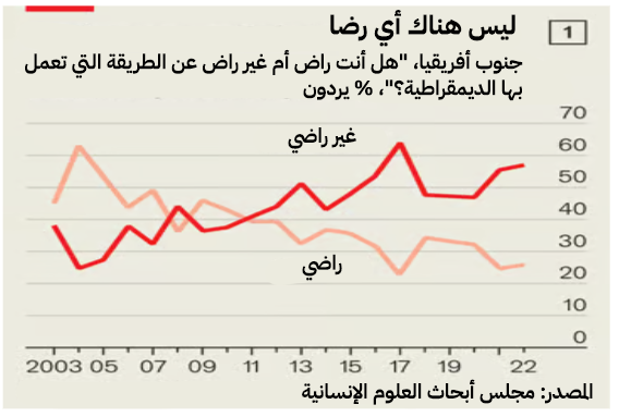 قبل عقدين من الزمن كان عدد سكان جنوب إفريقيا الراضين عن الديمقراطية أكثر من ضعف عدد غير الراضين عنها، أما اليوم فقد انقلبت الموازين (انظر الرسم البياني 1). قال ما لا يقل عن 79 بالمئة من المشاركين في الاستطلاع إن القادة السياسيين لا يمكن الوثوق بهم، مقارنةً بـ 21 بالمئة قبل عقد من الزمان فقط. ومنذ سنة 2010 تقريبًا، قال عدد أقل من مواطني جنوب إفريقيا إنهم يعتقدون أن العلاقات العرقية أفضل الآن مما كانت عليه في سنة 1994 (انظر الرسم البياني 2).
