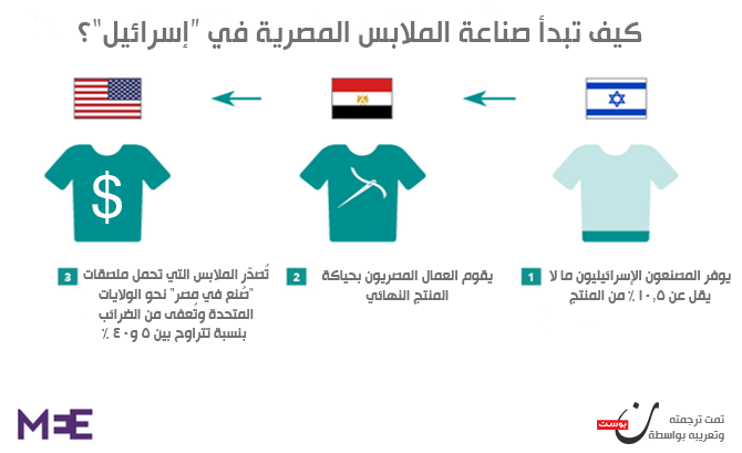 من خلال “المناطق الصناعية المؤهلة”، يوفر المصنعون الإسرائيليون ما لا يقل عن 10.5 بالمائة من المواد المستخدمة في صناعة الملابس. وفي مرحلة لاحقة، يقوم عمال المصانع المصرية في 705 مصنع مصادق عليه من قبل اتفاقية الكويز بحياكة المنتج النهائي الذي يُصدّر إلى الولايات المتحدة ويُعفى من الضرائب بنسبة تتراوح بين 5 و40 بالمائة، ولكنها عادة ما تكون بمعدل 15 بالمائة.