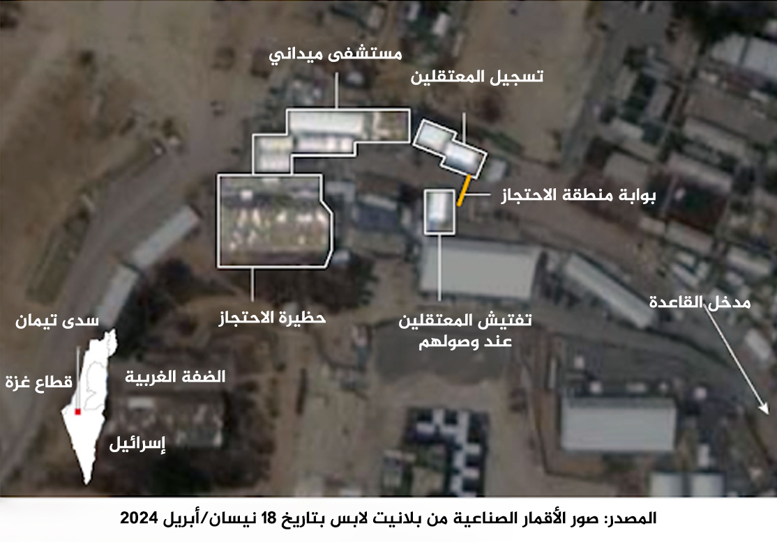 بحلول أواخر أيار/مايو؛ قالوا إن القاعدة ضمت ثلاثة مواقع احتجاز: عنابر يُحتجز فيها المعتقلون بواسطة الشرطة العسكرية؛ والخيام القريبة حيث يعالج المعتقلون على يد أطباء عسكريين؛ ومنشأة استجواب في جزء منفصل من القاعدة يعمل بها ضباط استخبارات من مديرية المخابرات العسكرية الإسرائيلية والشاباك.