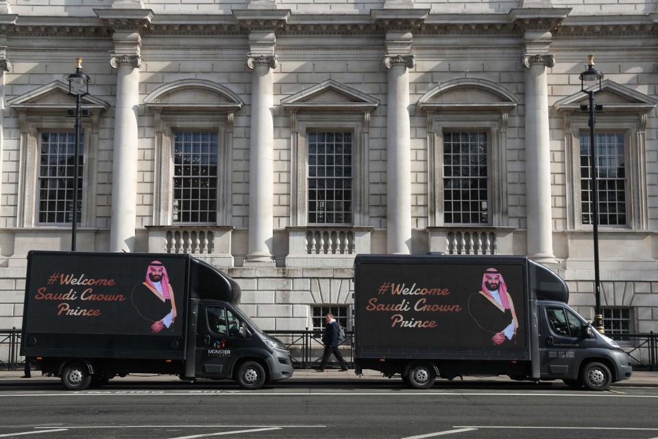 شاحنات تحمل رسائل ترحيب بولي العهد السعودي، الأمير محمد بن سلمان، في “وايت هول” وسط مدينة لندن في السابع من آذار/ مارس.