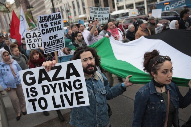 أعضاء من الجالية الفلسطينية ومناصرون لهم، يتظاهرون ضد قرار دونالد ترامب بنقل السفارة الأمريكية في “إسرائيل” للقدس في 15 أيار/ مايو 2018 في شيكاغو.