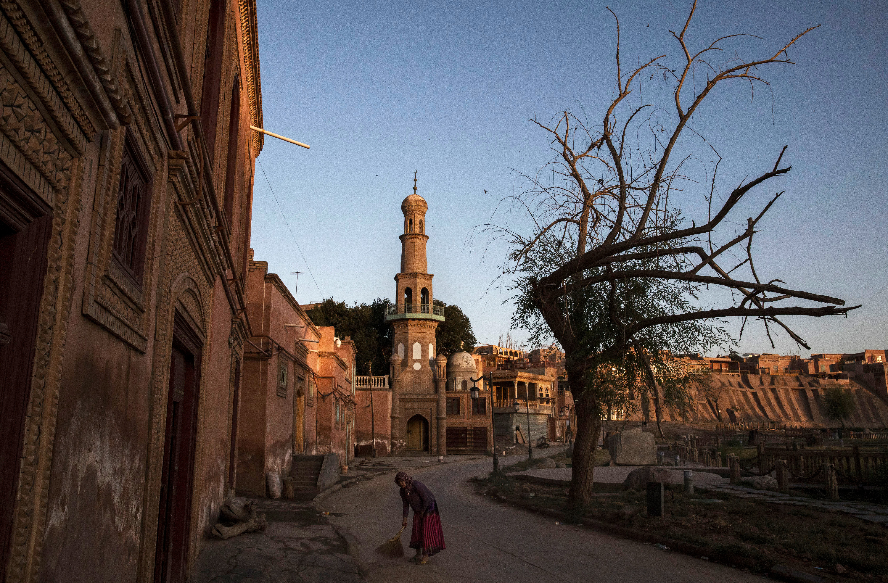 امرأة من الأويغور تكنس خارج منزلها يوم 1 تموز/ يوليو 2017 في البلدة القديمة لمدينة كاشغر بمحافظة سنجان أقصى غربي الصين