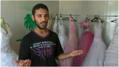 عاطف، من المدينة الاقتصادية درعا الغنية برجال الأعمال بحكم مجاورتها للأردن، لجأ الى مخيم الزعتري قبل قرابة العام ليفتتح مؤخراً معرضاً لتأجير بدلات الأعراس داخل المخيم .