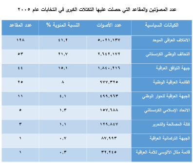 في الوقت الذي توزعت فيه أصوات السنة على جبهة التوافق العراقية، والوطنية العراقية (إياد علاوي)، والحوار (سالم المطلك)، ليكون نصيب هذه القوائم الثلاثة مجتمعة 3،4 مليون صوت حصلت من خلاله على 31٪ من البرلمان، ولتنخفض أصوات السنة في 2010 إلى 3.2 مليون صوت مع ثبات النسبة بـ 31٪ من المقاعد لكل من قائمة إياد علاوي والتوافق – وهي ما تبقى من جبهة التوافق عام 2005 -، بينما حاز الأكراد على نسب 22٪، 23.6٪ من مقاعد البرلمان في انتخابات 2005، 2010 على التوالي.