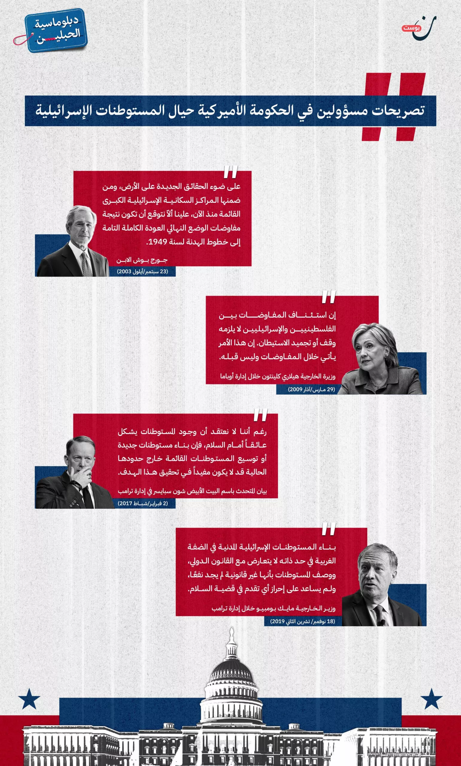 إن الواقع يشي بوحدة الحال، ففي مقال نشره الدبلوماسيان الأمريكيان آرون دايفيد ميلر ودانيال كرتزر، اللذان خدما في السلك الدبلوماسي الأمريكي وعملا كمبعوثين للشرق الأوسط في فترات رئاسية مختلفة تحت حكم الديمقراطيين والجمهوريين على السواء، شكك الكاتبان في كون إدارة ترامب حين أعلنت عبر بومبيو مشروعية المستوطنات، قد خالفت تقليدًا حقيقيًا فعالًا للإدارات السابقة.