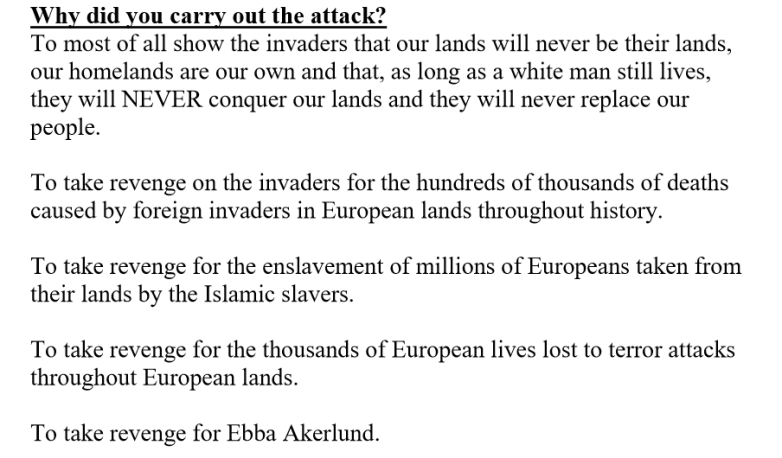 وأوضح في بيانه أن ما قام به كان للتخلص من الغزاة الموجودين في الأراضي الغربية، ومن ثمّ وصف الهجوم بأنه عمل “انتقامي من الغزاة من أجل مئات آلاف الوفيات التي تسبب فيها الغزاة الأجانب بالأراضي الأوروبية على مر التاريخ، وآلاف الأرواح الأوروبية التي أزهقت نتيجة للإرهاب المنتشر في الأراضي الأوروبية”، كذلك عزفه على وتر تقليل معدلات الهجرة لبلاده وغيرها من البلاد الأوروربية كأحد سياقات التبرير لديه.