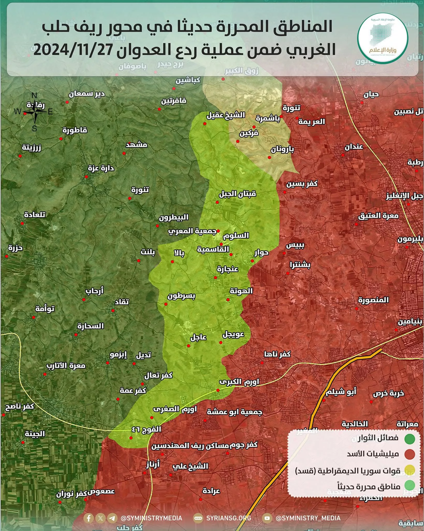 في حصيلة أولية، أكدت إدارة العمليات العسكرية الخاصة بالغرفة عبر قناتها في “تلغرام”، تحرير “الفوج 46″، أحد أكبر معاقل قوات النظام والميليشيات الإيرانية على أطراف مدينة الأتارب، الذي يربط بين ريف حلب وريف إدلب من جهة معارة النعسان، وطرد قوات النظام من قرى وبلدات غربي حلب وهي: الشيخ عقيل، بالا، قبتان، حيردركل، القاسمية، كفربسين، حور، جمعية المعري، السلوم، عنجارة، عاجل، جمعية أبو عمشة، الهوتة، أورم الصغرى، ريف المهندسين الثاني، أرناز، إضافة لأسر وقتل 37 عنصرًا من قوات النظام وميليشياته على جبهة الفوج 46 واغتنام 5 دبابات، و4 بي إم بي، ومدفع 57، و3 مدافع شيلكا، و4 مدافع هاون، ومستودع لصواريخ كورنيت في قرية الهوتة، وتحييد عشرات المدفعيات ومنصات إطلاق الطائرات المسيرة التي كانت تستهدف المدنيين في المناطق المحررة.