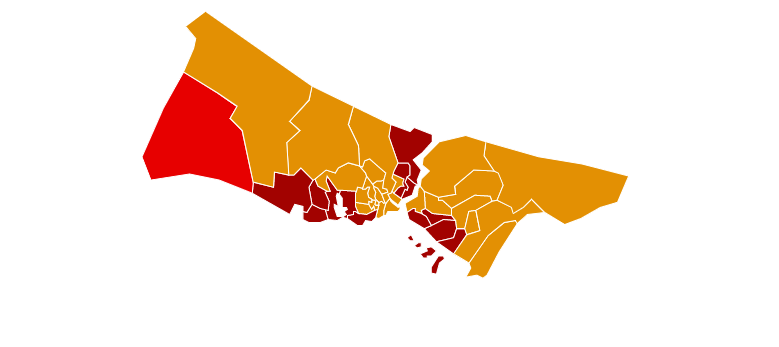 اللون الأحمر البلديات التي صوتت لمرشح المعارضة أكرم إمام أوغلو بنسبة تفوق 50%، واللون الأصفر لمرشح حزب العدالة والتنمية بن علي يلدرم (23 من يونيو)