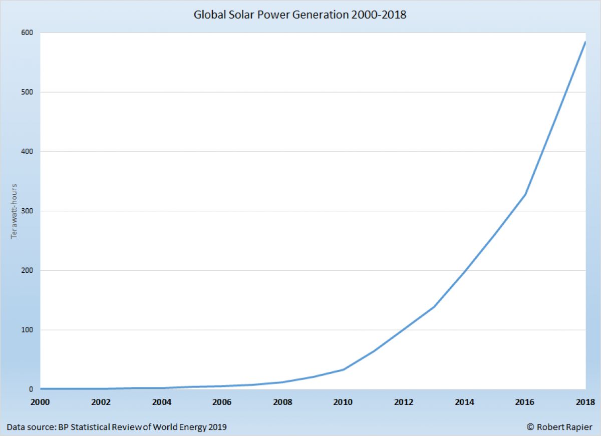 بين سنة 2007 و2017، نمت فئة الطاقات المتجددة بمعدل سنوي متوسط قدره 16.4 بالمئة. ولكن ضمن هذه الفئة، نمت الطاقة المتأتية من الحرارة الأرضية والكتلة الحيوية بمعدل سنوي قدره 7.1 بالمئة. وعلى النقيض من ذلك، نمت الطاقة المتأتية من الرياح بمعدل سنوي قدره 20.8 بالمئة ومن الشمس بمعدل سنوي قدره 50.2 بالمئة، على امتداد العقد الماضي. فكيف يبدو معدل نمو سنوي بنسبة 50 بالمئة خلال العقد الماضي؟ فيما يلي، الاتجاهات العالمية للطاقة الشمسية منذ سنة 2000: