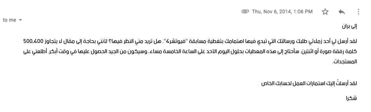 استنادا إلى هذه الميزة، بدأت بالتواصل مع صحيفة تحظى بمكانة مرموقة. في البداية، أرسلتُ نموذجين إلى اثنين من محرري الصحيفة دون الحصول على أي رد، لكنني واصلت المحاولة مع توخي الإزعاج، ودأبت على إرسال بريد إلكتروني واحد كل أسبوع أو أسبوعين.