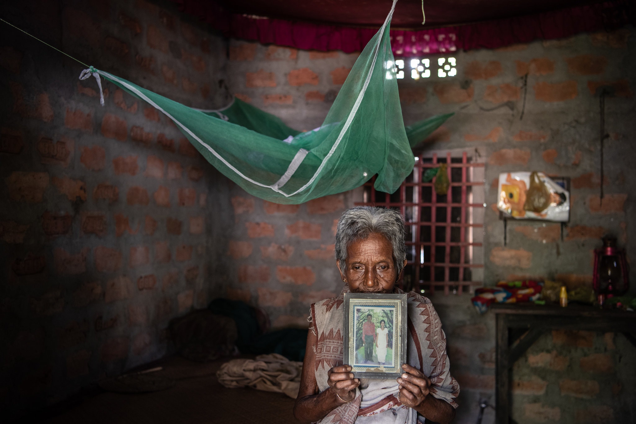 تحمل بيروس موني داس صورة لابنها بابن داس، الذي قالت إنه انتحر في سن الخمسين بعد أن حُذف من سجل المواطنين الهنود المؤكدين.