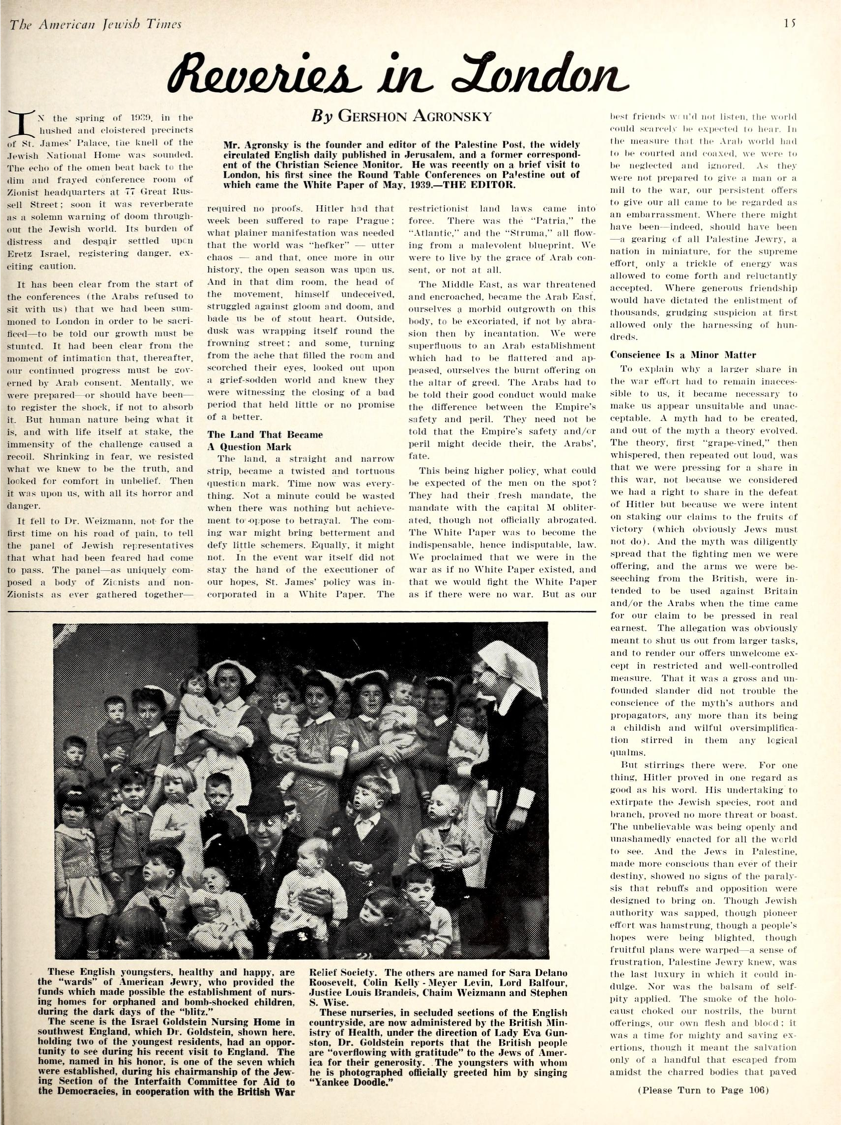 أنشأ آغرونسكي نشرة أسبوعية متعددة اللغات تدافع عن اليشوف، وتروج للسياحة والهجرة اليهودية إلى فلسطين، معززًا من علاقاته الإعلامية لخدمة المنظمة الصهيونية، ومع ذلك اصطدم بجدار التجاهل الذي فرضته وكالة الأسوشيتد برس، حيث رفضت نشر مقالاته، متمسكة بسياسة عدم التدخل في الشؤون اليهودية وتجاهلها لهذا الجزء من العالم.