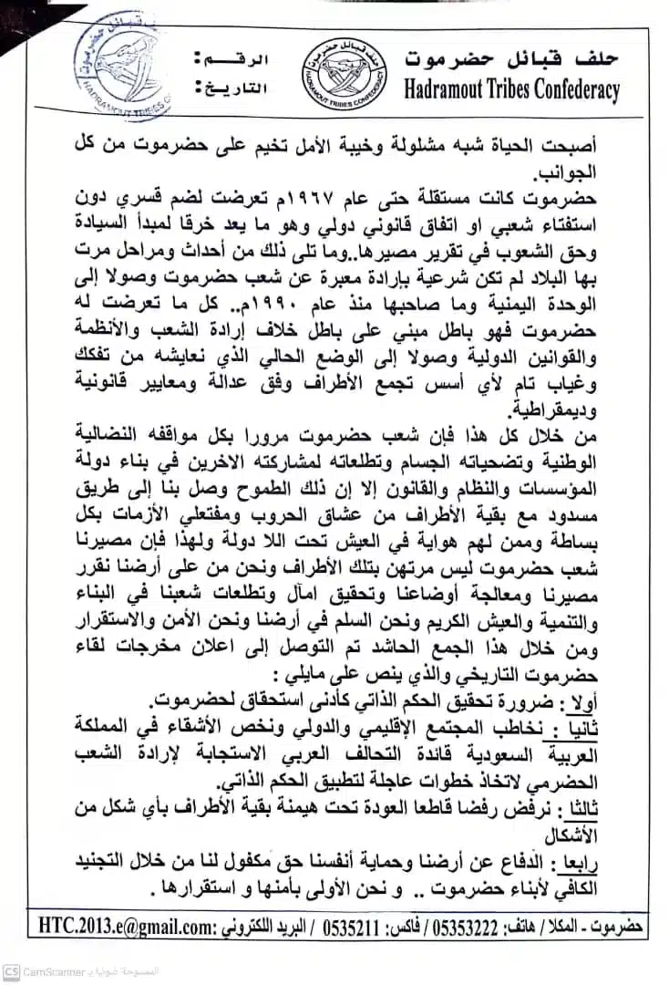 في 21 حزيران/يونيو العام الماضي، أعلنت المكونات الحضرمية إشهار “مجلس حضرموت الوطني”، وميثاق شرف، في ختام مشاوراتها في الرياض، برعاية سعودية.