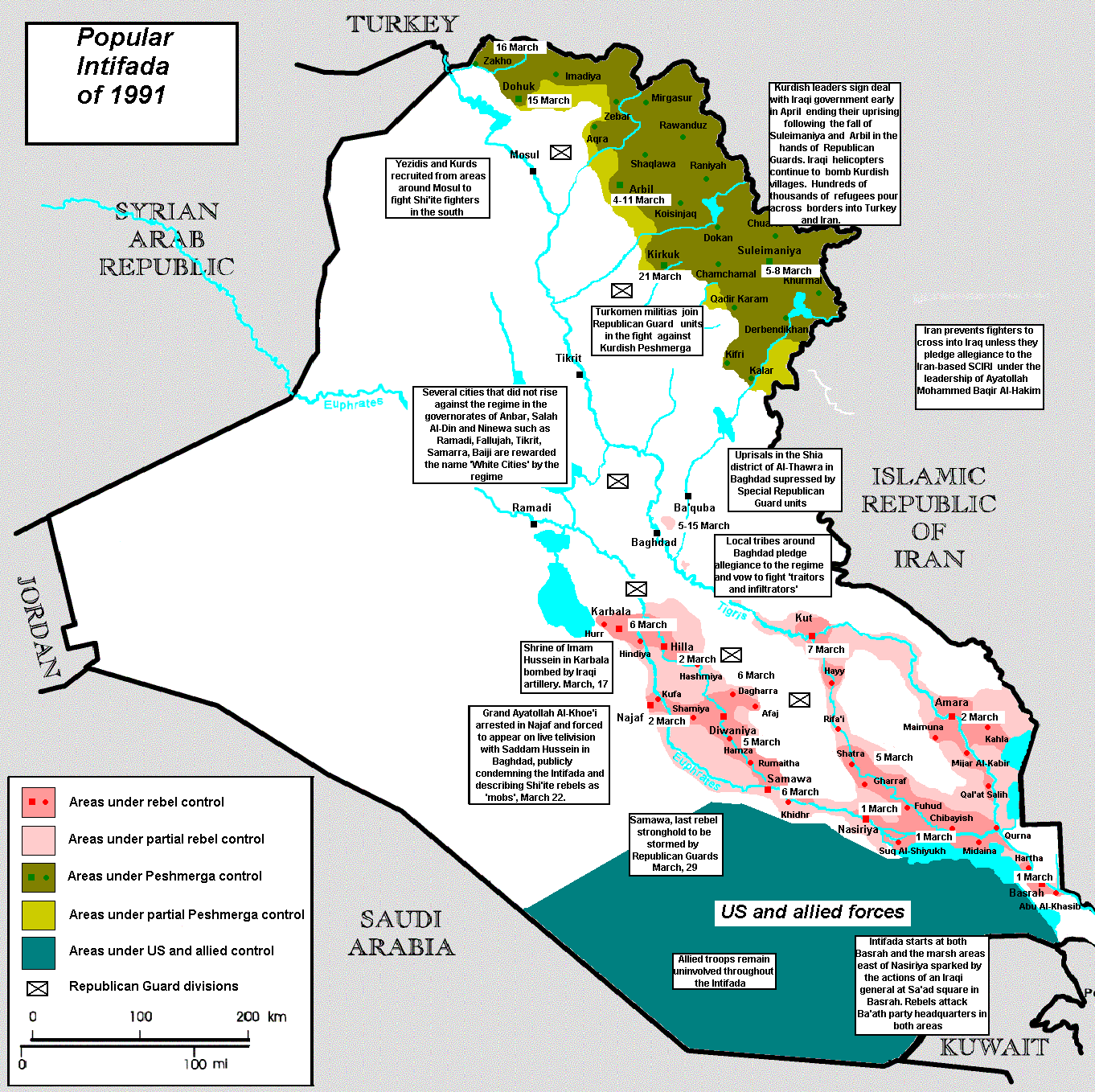 في مارس 1991، بدا صدام حسين أكثر هشاشة من أي وقت آخر بالنسبة للعديد من العراقيين، كانت حرب الخليج قد انتهت قبل أسابيع فقط، وقرر المتمردون الأكراد في الشمال والشيعة في الجنوب أن يطيحوا بصيام، دعا بوش الذي كانت قواته تتمركز قريبًا من العراق، العراقيين للانتفاضة ضد صدام، اعتقد العراقيون أن دعمًا أمريكيًا سيأتي، لكن ذلك لم يحدث، وبعد أن حقق المتمردون تقدمًا كبيرًا، لاسيما في الجنوب، انتصر صدام عليهم وقتل الآلاف انتقاماً، وبذلك عزز صدام من قبضته على البلاد في نهاية المطاف، لكن انتهاكات صدام وفرت جزءًا من الدوافع التي ساقها جورج بوش الإبن لغزو العراق في 2003