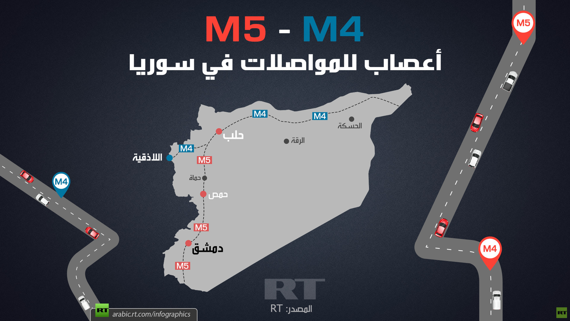 رسم يوضح الطريقين الدوليين M4 وM5، من “روسيا اليوم”.