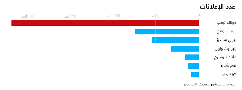 يتفوق ترامب على منافسيه الديمقراطيين على فيسبوك. والمرشح الديمقراطي الذي يتصدر قائمة المرشحين الأكثر إنفاقا هو توم ستاير بـ 16.8 مليون دولار مقابل 12.704 إعلانا فقط نشر على المنصة الافتراضية على مدار السنة، بينما يعد العمدة السابق لبلدة ساوث بيند في ولاية إنديانا، بيت باتيغياغ، هو الأقرب من العدد الجملي لإعلانات ترامب بـ 74.286 إعلانًا.