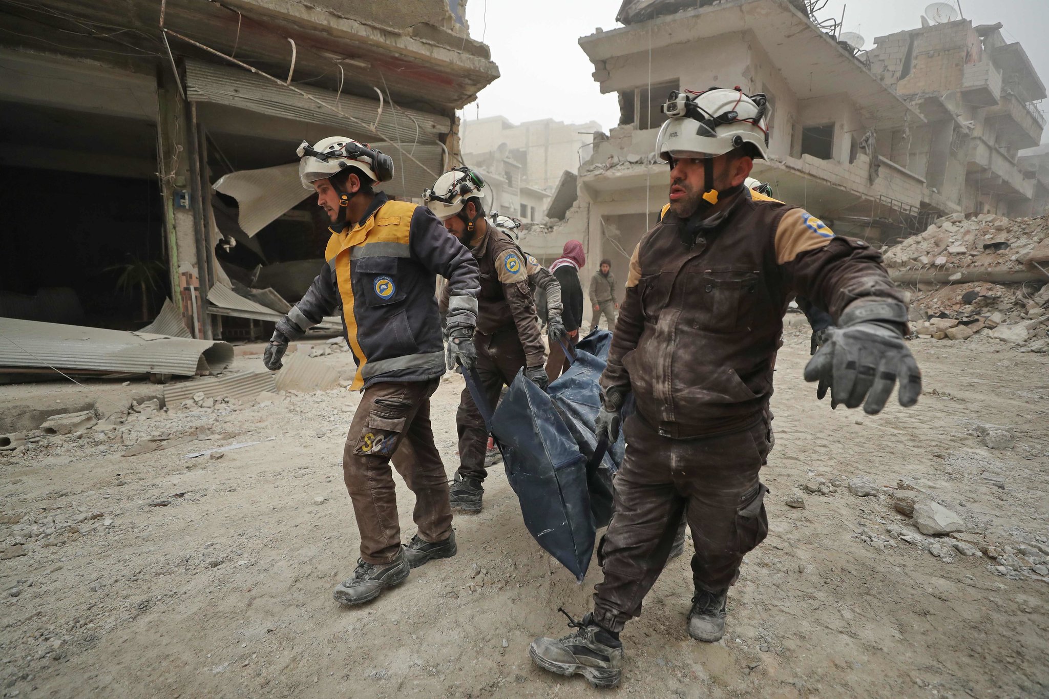عمال الإنقاذ المعروفون باسم “الخوذ البيضاء” يحملون جثة إحدى ضحايا الضربات الجوية في أريحا في محافظة إدلب التي يسيطر عليها المتمردون في سوريا.