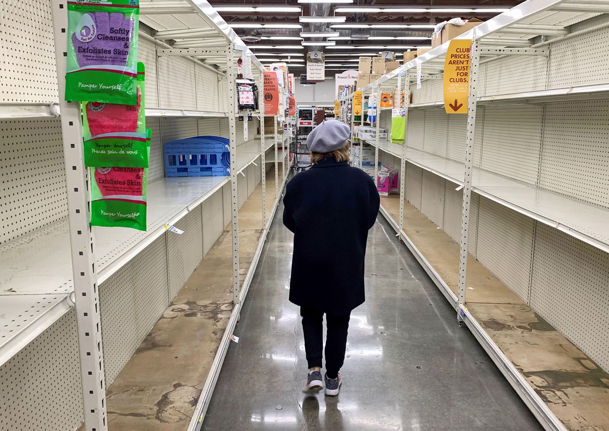 أحد المشترين يتجول بين الأرفف الفارغة التي كانت تحمل عادة الصابون والمطهرات والمناشف الورقية في متجر فاينال آند سمارت في جليندال بولاية كاليفورنيا يوم 7 من مارس 2020، فالمخاوف من فيروس كورونا نشرت الذعر بين الناس ما دفعهم لتخزين الأطعمة المعلبة بالإضافة إلى منتجات التطهير والنظافة الشخصية.