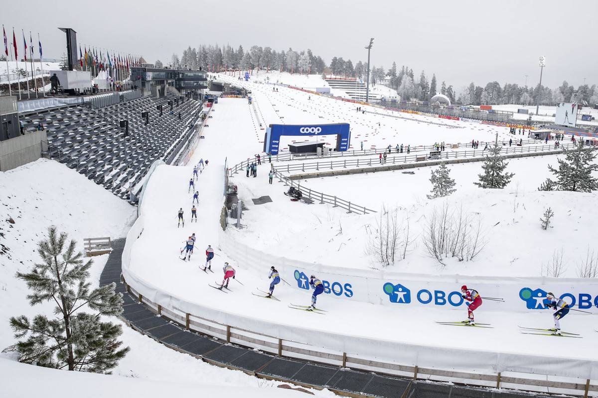 تظهر مقاعد المشاهدين فارغة نتيجة الإجراءات الوقائية المتعلقة بانتشار فيروس كورونا، بينما تبدأ المتسابقات في سباق التزلج الريفي للسيدات بطول 30 كيلومترًا، في كأس العالم للتزلج يوم 7 من مارس 2020 في هولمينكولين بالنرويج.