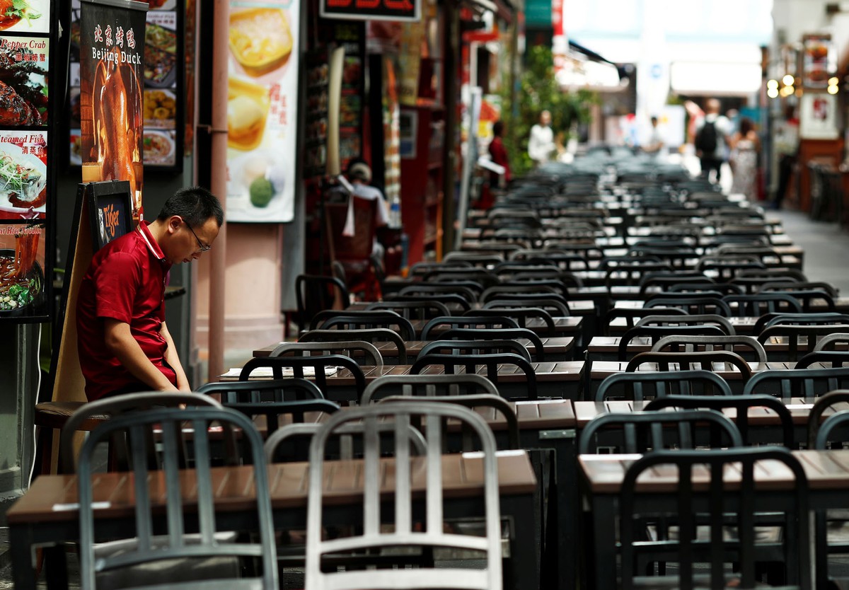 مروج مطعم ينتظر الزبائن في مساحة كبيرة فارغ بالحي الصيني في سنغافورة حيث يتراجع عدد السياح نتيجة تفشي مرض كورونا يوم 21 من فبراير 2020.