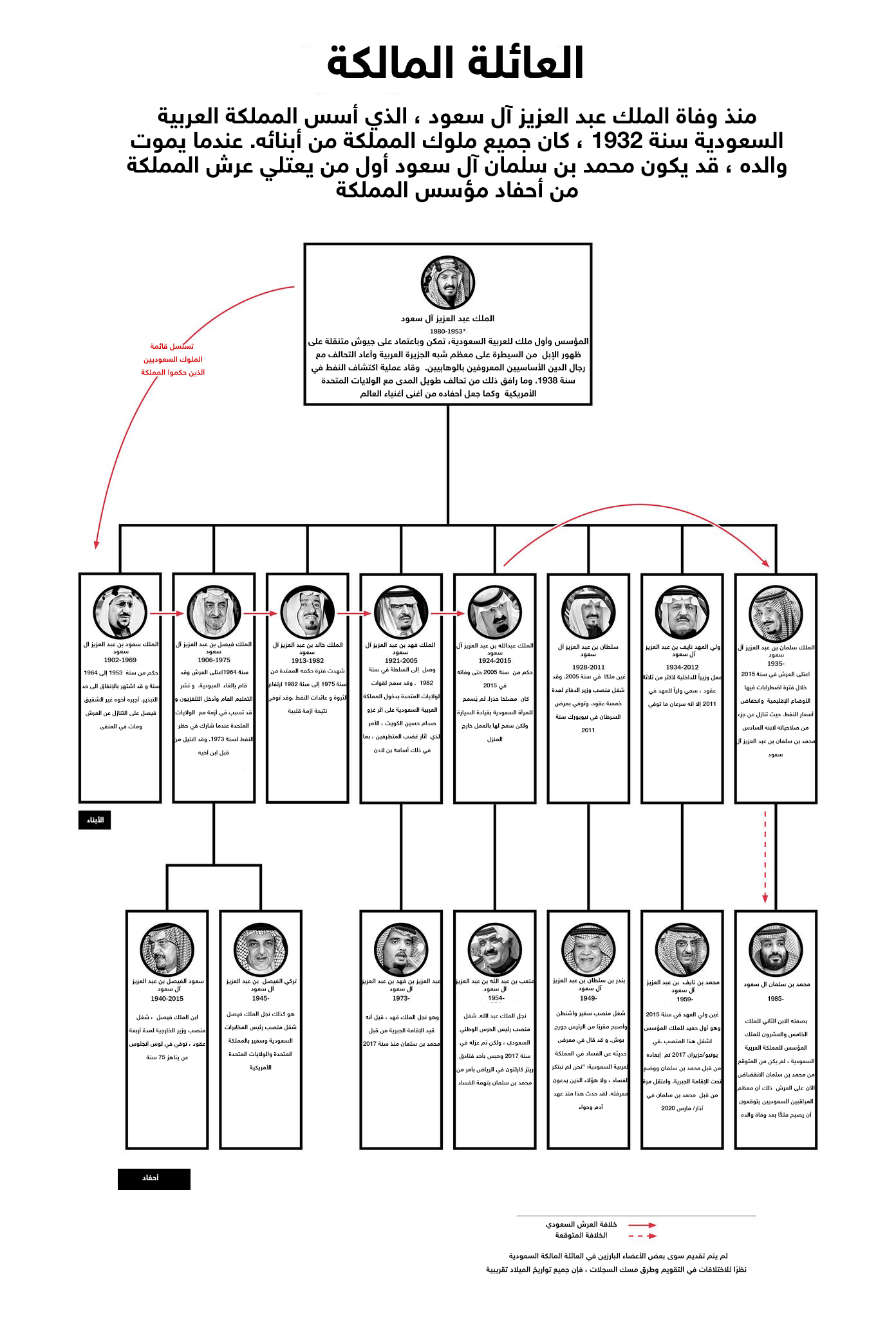 شكّل احترام العائلة للأقدمية طريقة الحكم في المملكة. فبعد وفاة الملك عبد العزيز سنة 1953، تداول أبناؤه الحكم من الأكبر إلى الأصغر، مع تجاوز بعض الإخوة غير الراغبين في الحكم أو أولئك الذين يعتبرهم بقية أفراد العائلة المالكة غير مؤهلين. (لم يكن للمرأة آفاق سياسية). تحت حكم الملك، كانت البلاد تدار من قبل كبار الأمراء الذين تقاسموا الحقائب الوزارية الرئيسية: الأمن الداخلي والجيش والحرس الوطني والشؤون الخارجية. وكانوا يتخذون القرارات الرئيسية بالتوافق.