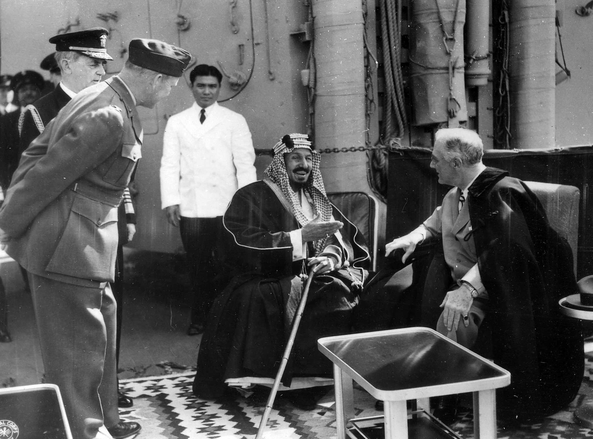 صورة للملك عبد العزيز آل سعود مع الرئيس فرانكلين روزفلت في مصر سنة 1945.